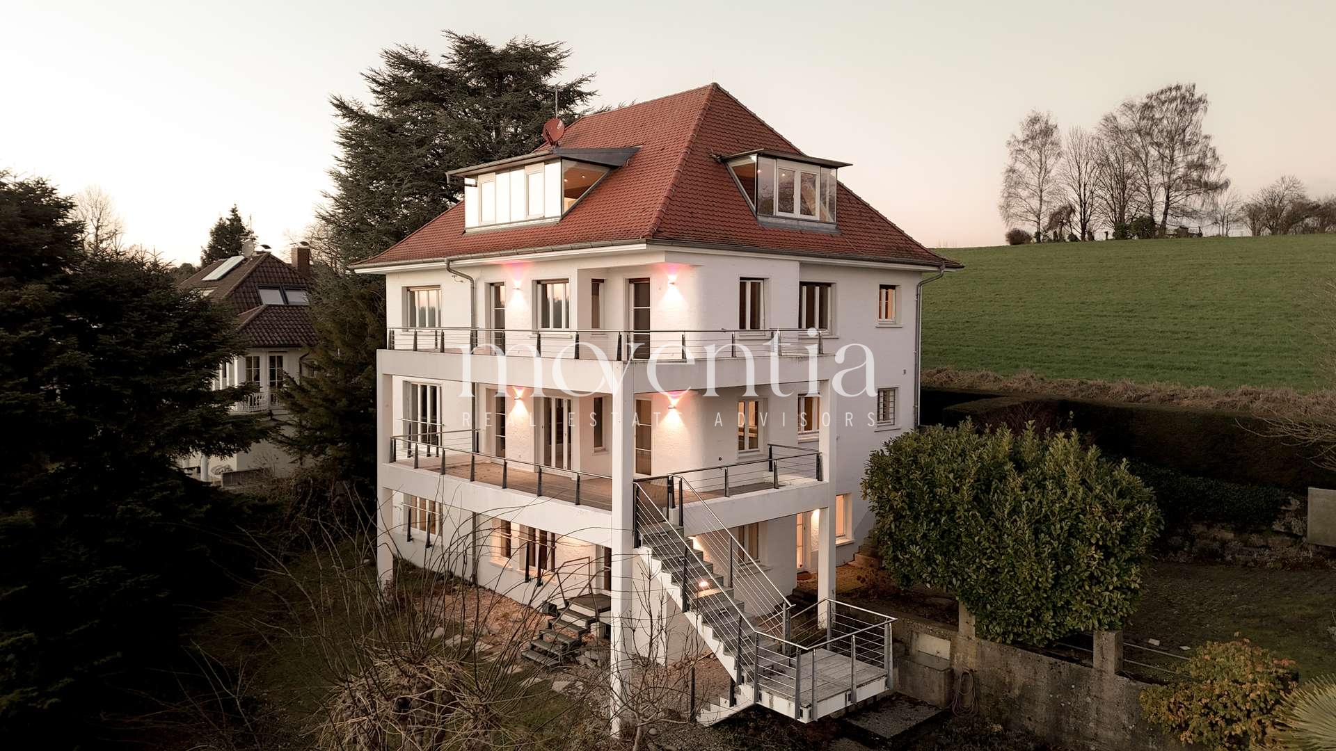 Diese außergewöhnliche Villa vereint zeitlose Architektur mit einer der begehrtesten Wohnlagen der Region. Als Haus der letzten Baureihe bietet die Immobilie ein Höchstmaß an Privatsphäre sowie einen dauerhaft unverbaubaren Ausblick. In südwestlicher Ausrichtung öffnet sich auf der Vorderseite der Blick auf den See und bei klarer Sicht auf das eindrucksvolle Alpenpanorama bis hin zum Säntis. Zur Rückseite hin schließt sich die grüne Landschaft rund um den Eglisbol-Aussichtspunkt an und schafft eine ruhige, naturnahe Rückzugsebene ohne direkte Bebauung. Die seltene Kombination aus Wasserblick, Fernsicht, Grünraum und Endlage erzeugt ein ausgewogenes Wohngefühl aus Offenheit, Ruhe und Geborgenheit.