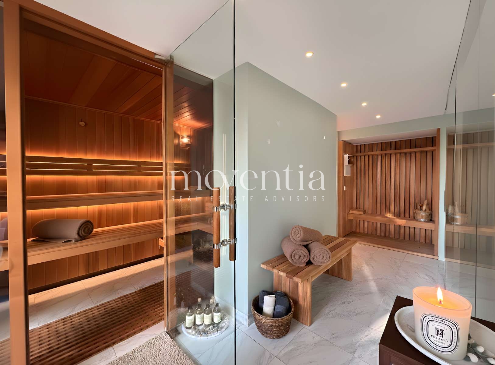 Das aufgrund der Hanglage vollwertig nutzbare Untergeschoss ist sowohl separat als auch über das Haus erreichbar und bietet vielseitige Nutzungsmöglichkeiten. Eine architektonisch eindrucksvolle Glastreppe führt vom Wohnzimmer in den stilvollen Wellnessbereich und erschließt zugleich die Einliegerwohnung, die zusätzlich über einen eigenen, separaten Zugang verfügt. Wellnessbereich und Einliegerwohnung können dabei bei Bedarf voneinander getrennt genutzt werden. Neben dem Wellnessbereich mit Sauna, Badezimmer und Waschküche kann die Einliegerwohnung sowohl als Fitnessraum, Büro oder auch multifunktionaler Arbeitsbereich genutzt werden. Auch von hier aus besteht Seeblick. Ergänzt wird das Untergeschoss durch einen großzügigen Gewölbekeller, der sich ideal als Wein- oder Lagerkeller eignet.