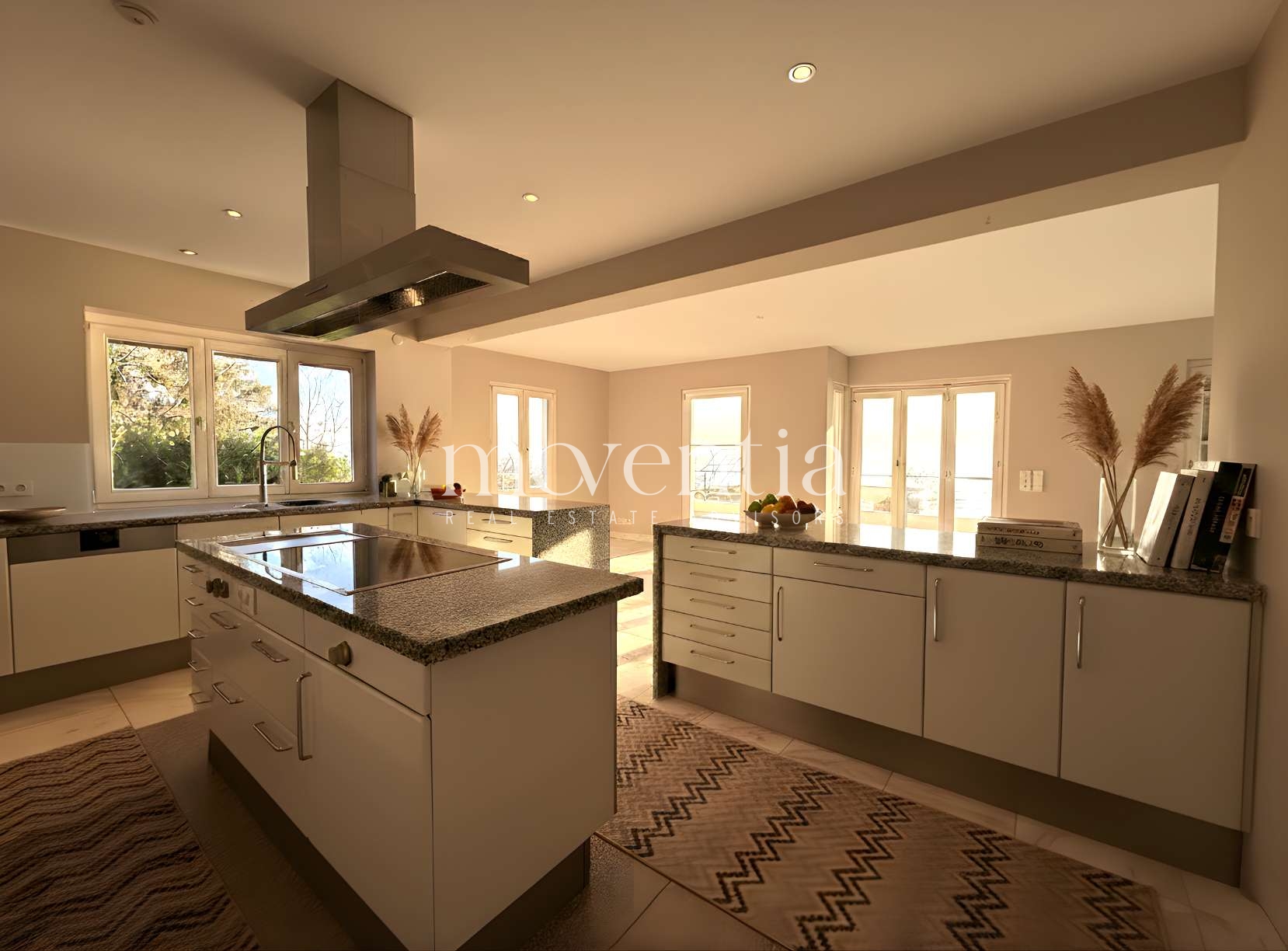 Bereits beim Betreten des Hauses eröffnet sich der direkte Blick auf den See. Der offen gestaltete Wohn- und Essbereich mit Kamin sowie die hochwertige Küche mit Gaggenau-Geräten, Granit-Arbeitsplatte und separater Speisekammer bilden das kommunikative Zentrum des Erdgeschosses. Von hier aus besteht direkter Zugang in den Garten.